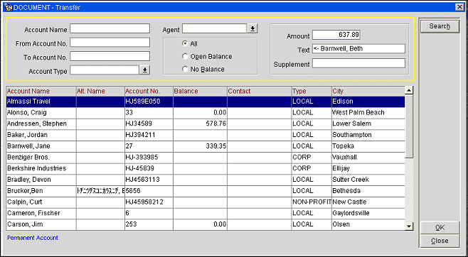 This screen allows you to select the target account to transfer the invoice or payment to. Use the search criteria to narrow the display of AR accounts.  Highlight the target account of your choice.  To perform the transfer, select the OK button. A message appears asking you to confirm your decision: "Are you sure?". Select the Yes button to proceed with the transfer. The transferred invoice or payment now appears on the Account Maintenance screen of the account to which it was transferred.