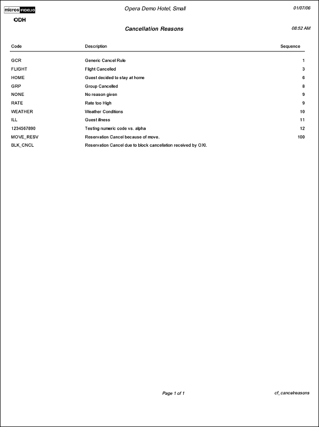 The Configuration report for Cancellation Reasons will display all Cancellation Reasons that have been configured. Cancellation Reasons are not property specific. When a reservation is canceled, the user is prompted with a single select list of values to select the reason the reservation is being canceled. When in F7 for Multi Property or ORS, the user can Move an existing reservation to another property. When moving the reservation, the user is prompted with the Cancellation Reasons List of Values to select for Cancellation of the Reservation at the existing property.