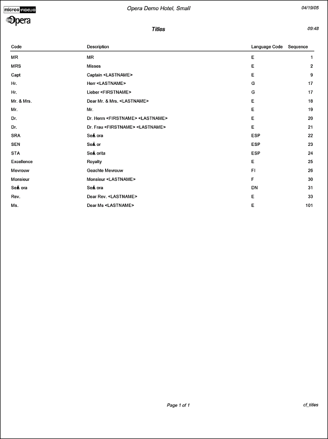 The Configuration report for Titles will display all Titles that have been configured.  The output includes the language the Title has been associated.  Titles are associated on the Profile form.