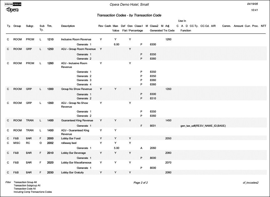 The Configuration report for Transaction Codes will display all Transaction Codes that have been configured in the application. The report information will be in numerical order by Transaction Code.