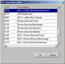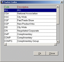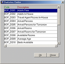 Selecting OK with the Transaction Codes (Market Codes or Statistic Codes) option highlighted displays the transaction code table (Market Segment Code table or Daily Statistic Codes) where all transaction codes (Market Segment Codes or Daily Statistic Codes) are listed. On double clicking any transaction code (Market Segment Code or Daily Statistic Code), the translation codes that were previously set up would display, and the appropriate translations can be entered for that transaction code (Market Segment Code or Daily Statistic Code).