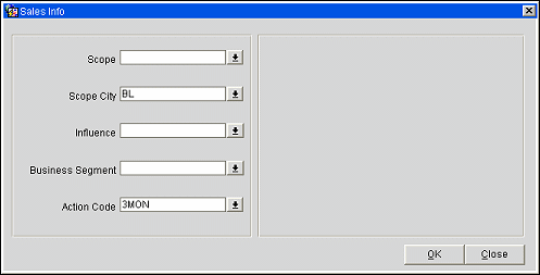 The Sales Info screen appears when you select the Sales Info tab from the Profile screen for a contact profile type. When the contact profile is sent from PMS to OCIS, all fields on this screen will be exchanged with OCIS and inserted with the profile.