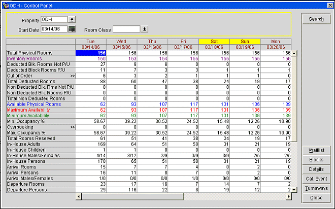 The Control Panel is a seven-day view of several essential property occupancy and availability statistics that can be used to determine the number of rooms that can be sold for a given date.