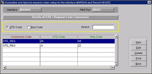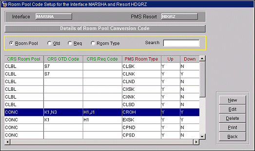 Rate Code/Block Code Conversion (MARSHA only) - If a pick-up from a block is made in PMS, the PMS block code must be sent to MARSHA for the recognition of that reservation as a group reservation. This is done through the rate/block code conversion table, where users have to enter newly created PMS block codes linked to the rate codes they are using with that block. During upload, the table is evaluated and if the rate code found has a block code linked to it, the message is sent as a group booking to MARSHA. The corresponding Mini hotel component is used for upload only. In this case a block code has to be uploaded to the CRS although the reservation is not attached to a block in PMS.