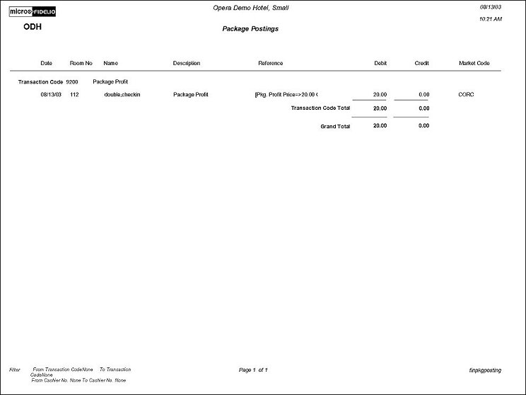 The Package Postings Report displays all posted charges that have been associated with a package. This report provides users with summary information about package postings and serves as an audit trail on cashiers and transaction codes.