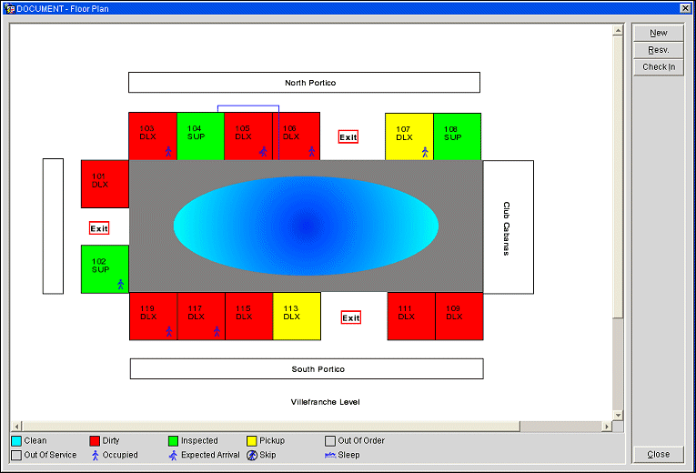 The floor plan shows which rooms are occupied and uses color coding to show at a glance the housekeeping status of each guest room. You can also view room and room type information for each room..