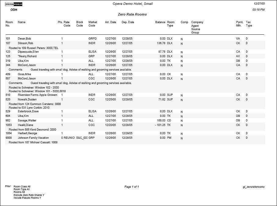 The Zero Rate Rooms Report displays all guests that have zero rates. Sharing guests will be zero-rate candidates in most cases. Print this report to determine which in-house guests should or should not be at zero rate status.