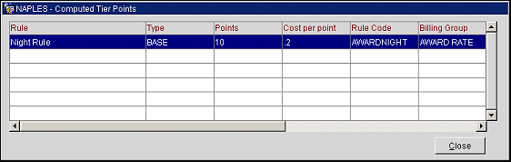 Tier Points. Display the Points Accrued screen for the current points transaction.  This screen shows the validated rule used to generate tier points, the type of points, number of points, cost per point, rule code for the award points, billing group the points belong to, award bucket qty., tier bucket qty., award points, tier points, rule points, and qualified revenue. The Qualified Revenue column in the table shows the total qualifying revenue in central currency for the membership points transaction.