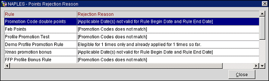 Points Rejection Reasons. Displays the Points Rejection Reason screen for the current points transaction. This screen shows the rule used to generate points and the reason points were not awarded (validation failure reasons); for example, "Membership level requirements not met." These reasons are hard coded and cannot be changed.