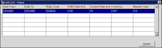 View Rate. Display the Rates screen for the current points transaction. This screen shows the dates of the stay, the rate code, the PMS rate amount, the central rate amount, the central currency and the market code associated with the stay.