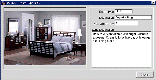 Once they have been configured, room type and room images are accessible from various places in OPERA. Pictures of rooms and room types can be displayed from the Available Room Search screen, Room Assignment screen, the Housekeeping Room Discrepancy screen, the Room Plan screen, the Floor Plan screen, the Rate Query screen and the Function Diary (when the OPS<version_number> Sales & Catering license is active). Along with the pictures are details about the room or room type.
