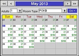 The availability calendar shows rate and availability information, as appropriate, for the current month. The buttons can be used to change the display for a different month and/or year: