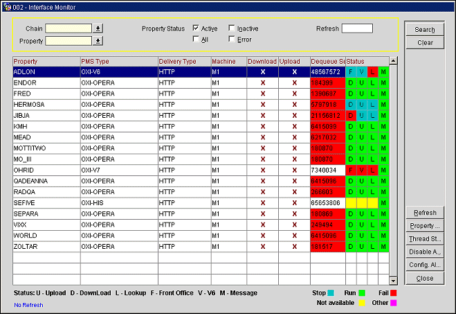 Users can access this screen with single OXI-HUB permission called Interface Status.  Use the Search or Refresh buttons to view active statuses.