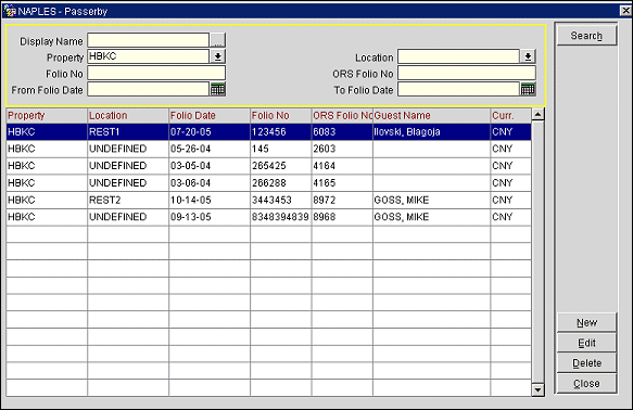 If you want to manually enter passerby revenue for a profile, select Profiles > Passerby. The Passerby screen appears. You can search for a specific profile by profile name (Display Name: Last name, First name), Property, Location, Folio Number and Date.