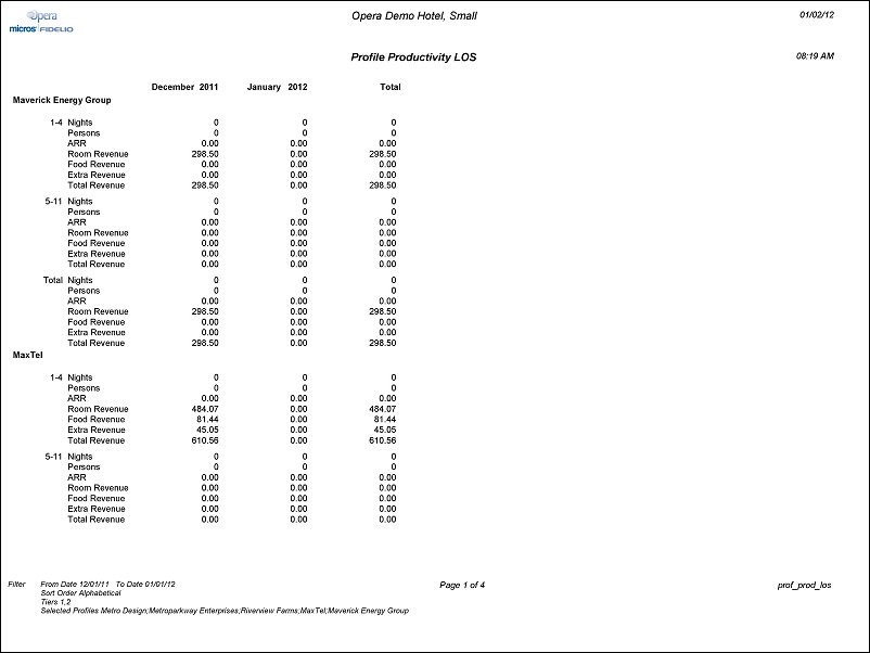 The Profile Productivity LOS allows the user to display profile production by pre-defined Length of Stay Groups. If the function RATE TIERS is not active, the Length of Stay groupings will be 1-4, 5-11, 12-29, and 30+ days.  When RATE TIERS is active, the report will use the Lengths of Stay configured by the Property in Configuration > Rate Management > Rate Classifications > Rate Tiers. The output will include a total of all nights, and if the report is printed for a Profile Type, a Grand Total of production for the Profile type will be displayed. Additional filters include defining a Minimum Number of Nights and a Minimum Amount of Revenue produced. The Revenue display will be a total of all revenues posted to the profile.