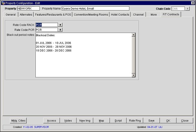 The FIT Contract Tab is used to set defaults for the Rack rate code, Published Corporate Rate (PCR) rate code and Blackout Notes. These values will then default to each FIT Contract generated for the selected property to show a comparison between the contracted rate on the contract document and the established rates of the selected property. To access the FIT Contract Tab, use the Property Details menu (Configuration>Property>Property Details) to display the Property Selection screen, then select your chosen property.