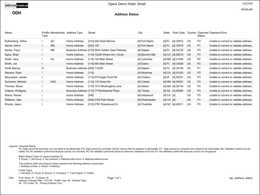 This report displays information in rows that are ordered from left to right. Each row will contain one profile meeting the search criteria selected in the following columns: Name, Profile Type, Membership, Address Type, Street, City, State, Post Code, Country, Cleansed Status, and Cleansed Error. These columns will remain in the report regardless of whether or not the profile contains data for that particular field. Additionally, Match Status Codes will display in brackets next to the entries for each of the following columns; Street, City, State and Post Code. The Match Status Codes are defined in the legend that will print on the bottom left of the last page of this report. Also defined in the legend, the Cleansed Status codes that are indicated in the Cleansed Status column on this report. Finally, selected filters will display in the bottom left corner of the last page of the report.