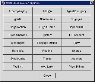 The Reservation Options menu is accessible from the Reservation screen,  from the Reservation Search screen, from the Arrivals screen and from the Waitlist screen. Access the Reservation Options screen by selecting the Options button from any of these screens.